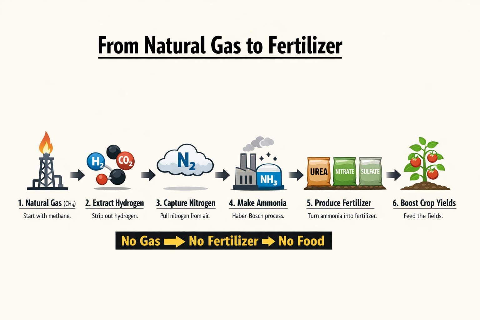 He’s 100 percent correct. Natural gas is where the real chokepoint exists and that’s because, for better or for worse, roughly half of global food production depends on synthetic fertilizer.
